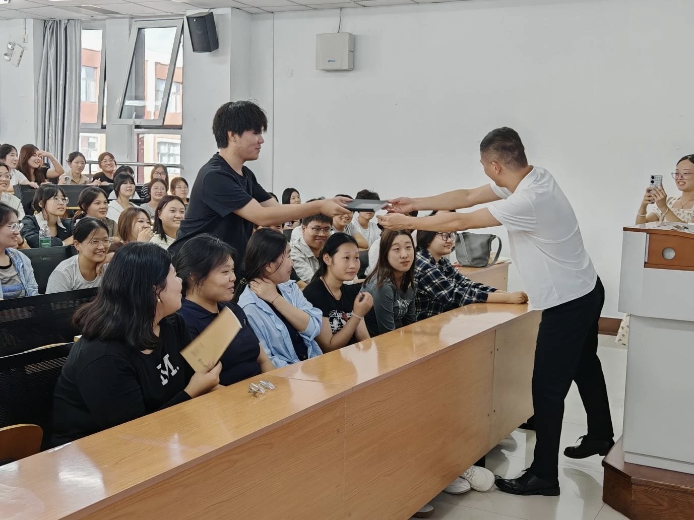 活动现场气氛热烈,互动环节师生频频交流。抢答环节中,同学们踊跃参与,在收获老师亲手赠予的小礼物同时,更深化了对专业知识的理解。最后的互动“愿景留言”环节,新生通过小程序描述“三年后想成为的样子”,79条充满希望的留言,展现了新一级物流学子的朝气与理想。