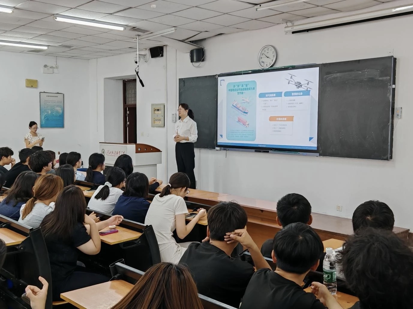 活动伊始,主持人王璐老师介绍了教研室的各位专职教师,随即通过三组生动的对比图拉开序幕:武汉火神山医院的物资保障展现物流担当,”双十一”亿级包裹配送体现物流效率,城市低空物流航线勾勒行业未来,这些鲜活案例瞬间点燃了新生对专业的兴趣与向往。